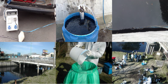 1) Los laboratorios interesados envían sus respectivos personal y equipos para tomar muestras en la desembocadura del arroyo Medrano al Río de la Plata, cruces de Av. Leopoldo Lugones y Av. Comodoro Rivadavia, detrás de la Escuela de Mecánica de la Armada. Se adjunta mapa y fotos demostrativos